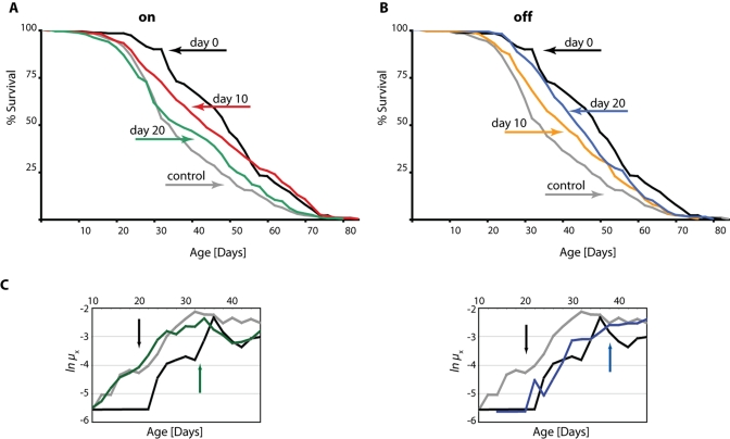 In order to better understand the dynamics of DN-Dmp53-dependent-life span extension we made use of the inducible GeneSwitch System for conditional expression of the DN-Dmp53 constructs in the adult fly brain. Using this system, we switched flies from food containing RU486 to non-RU food, and vice-versa. When expression of the DN-Dmp53 constructs was induced from the day of eclosion, a 47% median life span extension was observed, which is consistent with earlier observations [8]. When expression was induced later, at 10 or 20 days of adult life, median life span was still extended, but to a smaller extent (29% and 12%, respectively, Figure 1A; for statistical analysis of all life span experiments please refer to Table 1). We then performed the reverse experiment by switching flies back to non-RU486 containing food to stop induction of DN-Dmp53. These flies also showed extended life span, but the extension was again smaller than life span extension of flies with continuous expression of DN-Dmp53 (Figure 1B). While it is relatively easy to visualize the change in survivorship for flies switched at day 10, the differences for flies switched at day 20 was more subtle (Table 1). To further examine whether DN-Dmp53 expression turning on or off at day 20 has plastic, reversible effects on mortality, we compared age-specific mortality trajectories between cohorts. These data show that within 15-20 days after addition or removal of RU486 to day 20 flies there is a complete shift from the pre-switch mortality curve to the post-switch mortality curve. When plotting age-specific mortality rates (μx) on a natural log scale, we observed that mortality trajectories of flies shifted from control food (EtOH solvent control) to food containing RU486 (expression turned on at day 20), or shifted from RU486 food to control food (expression turned off at day 20), converged and fully reverted to the mortality levels of flies constitutively held on RU486 food ("on") or on control food ("off"), respectively (Figure 1C). We used Cox (proportional hazards) regression to analyze censored mortality data post-switch and to avoid making assumptions about the particular distribution (and thus shape) of mortality rates [9]. Twenty days after the switch, mortality trajectories of shifted and non-shifted flies converged fully and became indistinguishable from each other for both "on" and "off" treatments (day 20, switch off: p = 0.67; day 20, switch on: p = 0.16). Moreover, mortality trajectories of "off" (constitutively off and switched off) versus "on" (constitutively on and switched on) cohorts differed significantly (p = 0.0162) from each other (excluding the last 10 days of life), confirming convergence and the effectiveness of the "on" and "off" treatments. The delay in convergence most likely reflects some latency in induction kinetics of the RU-dependent GeneSwitch system (as well as the stop of induction), which we have also observed using a lacZ-reporter (data not shown). This reversible shift in mortality rates is reminiscent of what has been observed in flies switched from high to low calorie food (and vice-versa; data not shown and [9,10]), further supporting the idea that DN-Dmp53 and CR might employ similar mechanisms to extend life span [8,11].