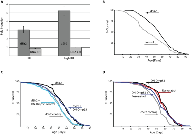 Next, we examined if DN-Dmp53 life span extension was additive to life span extension by dSir2. As shown in Figure 2C, no additive effects were observed when both proteins were over expressed in the adult nervous system, suggesting that the life span extending effects of DN-Dmp53 and dSir2 expression may be part of a common pathway related to CR.