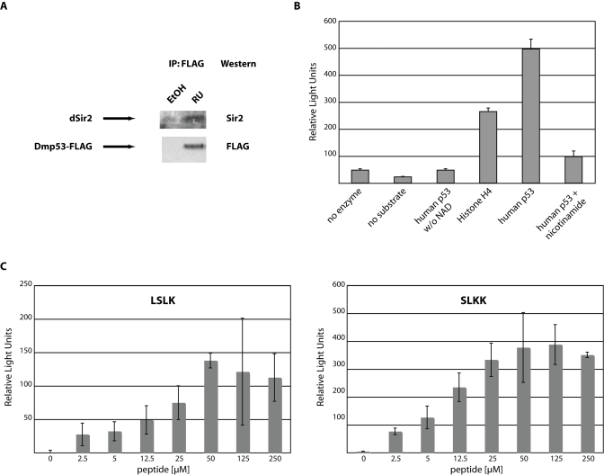 Human p53- and human histone H4-derived peptides were obtained from Biomol. Dmp53-derived peptides were manufactured by Biomol. Deacetylation assays were performed as described [12] using 1μl of recombinant dSir2 and 500μM NAD (Sigma). Released fluorescence was measured using a 96-well plate reader (Biotek Instruments) and plotted as relative fluorescence compared to background (Relative Light Units, RLU).