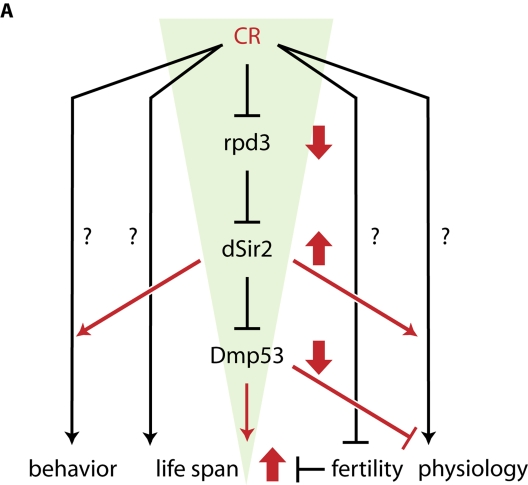 Here we further examine the possible role of Dmp53 in the CR signaling pathway. Our results indicate that Dmp53 is part of the CR signaling mechanism. We show that DN-Dmp53- and dSir2-dependent life span extensions are not additive. Importantly, Dmp53 and dSir2 physically interact, suggesting that Dmp53 is a down stream target of dSir2 deacetylation activity. Our data provide for a molecular ordering of the known components of the CR pathway in fruit flies, and thus present a framework for future research and hypothesis testing.