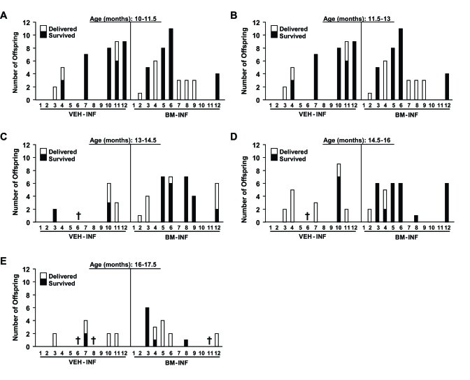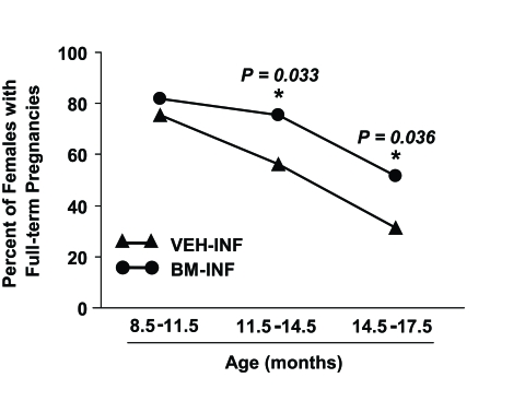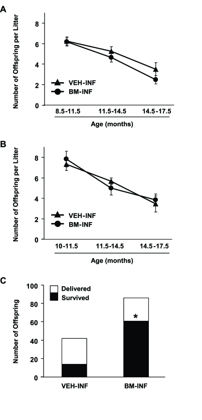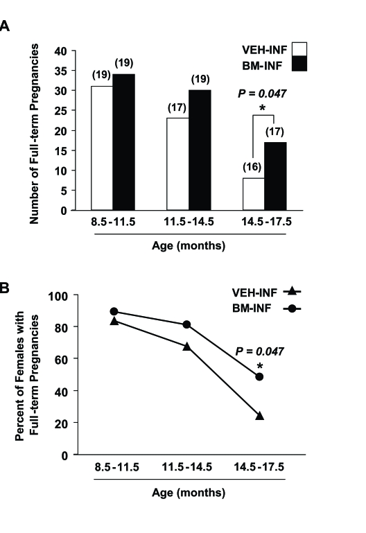 Between 3-8.5 months of age (prime reproductive life), VEH-INF (n = 20) and BM-INF (n = 20) females achieved a total of 56 and 59 full-term pregnancies, respectively, leading to the birth of offspring (data not shown). Between 8.5-11.5 months of age (transitional period leading up to reproductive failure), 19 remaining VEH-INF and 19 remaining BM-INF females delivered a total of 31 and 34 litters, respectively (Figure 1A). However, between 11.5-14 months of age (beginning of reproductive failure), 30 full-term pregnancies were achieved by the 19 remaining BM-INF females, whereas only 23 full-term pregnancies were achieved by the 17 remaining VEH-INF females (Figure 1A). Importantly, the two additional females that died in the VEH-INF group between 11.5-14 months of age had their last pregnancies at an approximately 8 months of age (data not shown). Thus, even if these two females were still present, it would be highly unlikely that they would have increased the total number of full-term pregnancies achieved by the VEH-INF females during this age bracket. The fertility of VEH-INF females declined even further between 14.5-17.5 months of age, with only 8 full-term pregnancies achieved by 16 remaining females. In comparison, 17 remaining BM-INF females delivered more than twice the number of litters between 14.5-17.5 months of age when compared with outcomes from the age-matched VEH-INF females (Figure 1A). Since the number of animals in each treatment group varied slightly with age, these data were re-calculated as a percentage of the total number of VEH-INF or BM-INF females that achieved full-term pregnancies during the indicated age brackets. This analysis reaffirmed that repeated BM-INF improved the reproductive performance of aging females, particularly between 14.5-17.5 months of age (Figure 1B).