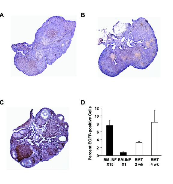 Donor cell tracking and EGFP chimerism in BM .For donor cell tracking, recipient ovaries were fixed in 4% paraformaldehyde, embedded in paraffin and sectioned for analysis using a GFP-specific antibody (sc-9996; Santa Cruz Biotechnology, Santa Cruz, CA), as detailed previously [11,16]. Positive and negative controls consisting of ovarian tissue from β-actin-EGFP transgenic females and wild-type C57BL/6 females, respectively, were analyzed in parallel on the same slides.
