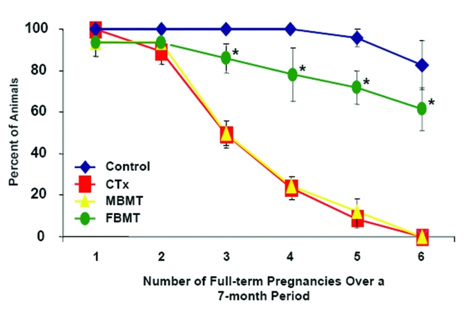 Regenerative medicine has also recently come into play in the context of female reproductive biology based on results showing that bone marrow (BM) transplantation (BMT) into chemotherapy-conditioned female mice generates a small number of donor-derived oocytes contained within immature follicles [11,16] but does not yield mature (fertilization competent) donor-derived eggs [16,17]. Similarly, spermatogonia, but not mature sperm, have been derived from BM of male mice [18,19] and men [20]. While these latter findings suggest that gametes arising from BM-derived cells exhibit a maturational defect, clinical studies have linked BMT to a return of gonadal function and fertility in some cancer survivors following high-dose chemotherapy [21-27]. These data and results from a recent study reporting a comparable rescue of long term-fertility in chemotherapy-treated female mice following BMT [16] further support that adult stem cell-based technologies may provide a novel means to restore or sustain reproductive organ function. Herein we tested in mice if once-monthly intravenous BM infusions (BM-INF), administered without prior radiation or chemotherapy conditioning, could delay age-related failure of the female reproductive axis.