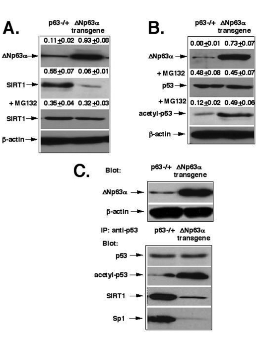 For these studies, we used primary mouse epidermal keratinocytes obtained from mice with p63-/+ heterozygous inactivation [45] and the ΔNp63α transgenic mice [29], as previously described [46,47]. Using the primary mouse epidermal cell culture, we found that the protein levels of SIRT1 were significantly lower (by 9-fold) in cells obtained from the ΔNp63α transgenic mice (0.06+0.01) than in the cells prepared from p63-/+ mice (0.55+0.07, Fig. 1A). We further found that the 26S proteasome inhibitor, MG-132, dramatically modulated the SIRT1 protein degradation effect, which was likely to be induced by ΔNp63α dramatically increasing the SIRT protein levels (Fig. 1A). We also showed that levels of acetylated p53 were much greater (by 4- fold) in the ΔNp63α transgenic mice (0.49+0.06) than in p63-/+ mice (0.12+0.02), while the p53 protein levels were practically unaffected (Fig. 1B). Next, we observed that the protein complex formation between p53, SIRT1 and Sp1 dramatically decreased in the ΔNp63α transgenic mice compared to p63-/+ mice (Fig. 1D).