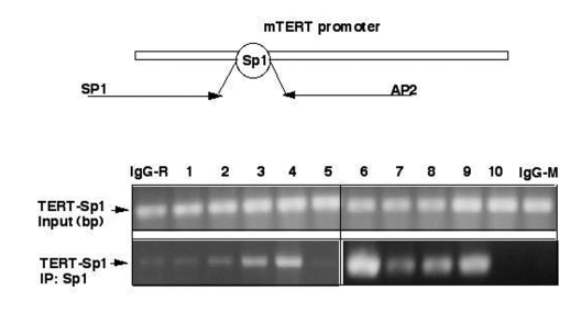 Chromatin immunoprecipitation (ChIP). ChIP assays were performed using the antibody against mouse Sp1 (Upstate Biotechnology) or rabbit immunoglobulins as negative controls (Sigma) and ChIP assay kit (Upstate) on primary mouse keratinocytes as previously described [53,54]. The proteins bound to DNA were cross-linked using 1% formaldehyde for 10 min at 37°C and the protein-DNA complexes were precipitated with a primary antibody against Sp1. After reversal of the cross-links and DNA recovery, the latter was used as a template to amplify the mTERT-derived Sp1 promoter region using the following primers: sense, 5'-CTCA CTGTCTGTGCAACCACAGCAGCTG-3' (position-363), and antisense, 5'-AGAGCACCGCGGGGCAA CGAGGAGCGCG-3' (position +143) producing a 506 bp PCR product. The PCR products were run on 2% agarose gels and visualized by ethidium bromide.