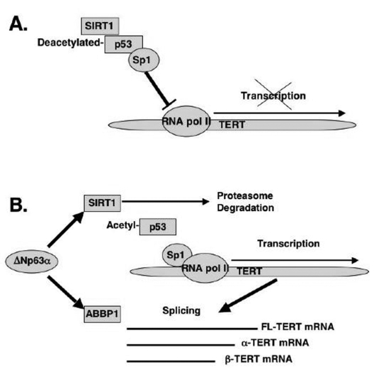 In the current report, we showed that from the first hand, ΔNp63α induced the mTERT promoter activation through the down regulation of the SIRT1 protein levels, inactivation of p53 deacetylation, decrease of the p53/Sp1 protein-protein complexes, and the overall induction of mTERT transcription regulation (Fig. 6A). From the other hand, by a forming of protein-protein complexes with the ABBP1-derived RNA processing/splicing complex (Fig. 6B), ΔNp63α induced the mTERT RNA splicing leading to an increasing expression of spliced mTERT isoforms playing a role of dominant-negative inhibitors of mTERT activity and therefore decreasing the levels of TERT activity in mouse epidermal keratinocytes overexpressing the ΔNp63α protein. The overall effect of the ΔNp63α overexpression resulted in decrease in telomerase activity and increase in replicative senescence observed in mouse keratinocytes. This dual molecular mechanism of telomerase regulation might underline the previously shown effect of p63 (ΔNp63α) on premature ageing phenotype observed in mice overexpressing the ΔNp63α protein.