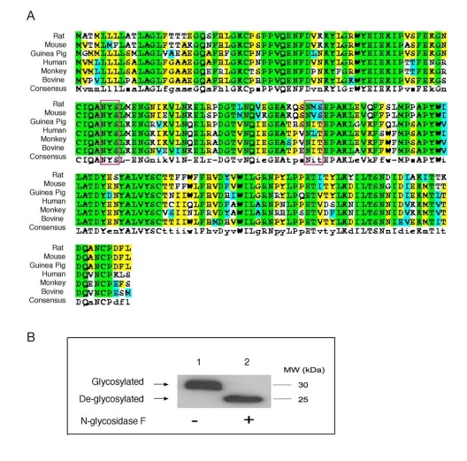 ApoD possesses two N-glycosylation sites (Asn45 and Asn78) [31], both of which are evolutionally conserved among species (Figure 1A). This raises the hypothesis that apoD is regulated at the post-translational level. In support of this hypothesis, we incubated aliquots of sera from normal C57BL/6J mice in the absence and presence of peptide:N-glycosidase F (PNGase F), an amidase that catalyzes the removal of carbohydrate moieties from N-linked glycoproteins. As shown in Figure 1B, pre-incubation of plasma apoD with PNGase F resulted in apoD de-glycosylation, as evidenced by the production of de-glycosylated apoD with reduced molecular masses. Likewise, serum apoD as well as apoD secreted from axillary glands in humans are also glycosylated [32,33]. While the physiological significance of this post-translational modification remained incompletely understood, it is suggested that N-glycosylation modulates apoD protein folding, resulting in conformational changes favorable for binding to its physiological ligands or association with HDL. In this context, it would be of significance to convert the two N-glycosylation sites Asn45 and Asn78 to alanine residues in apoD by site-directed mutagenesis. The resulting apoD mutants will be ideal molecules for determining the physiological impact of N-glycosylation on the ability of apoD to associate with ligands and/or with HDL in metabolism.