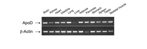 RNA isolation and RT-PCR assay. Total RNA isolation from tissue (20 mg) was performed using the RNeasy Mini Kit (QIAGEN, Valencia, CA). Aliquots of purified RNA (100 ng) from were subjected to RT-PCR analysis using apoD sequence-specific primersflanking the apoD mRNA for forward reaction (5'-TAAGGCCTCTCCTGCAGCCA-3') and reverse reaction (5'-CTTTACAGGAAGTCCGGGCAG-3'). The resulting PCR products were resolved on 1% agarose gel containing ethidium bromide and visualized by UV light.