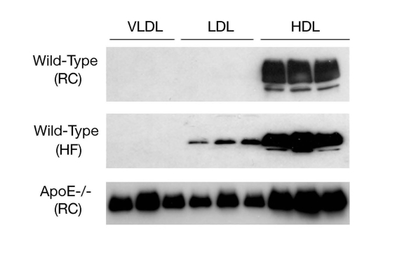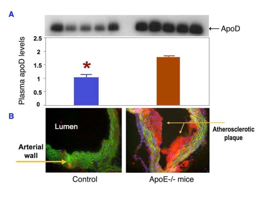 To recapitulate this clinical observation, we determined plasma apoD expression in normal and atherogenic mice with genetic depletion of apolipoprotein E (apoE), a commonly used rodent model of atherosclerosis. ApoE knockout mice display a marked increase in total plasma cholesterol levels and develop atherosclerosis with the deposition of fatty streaks in the proximal aorta at 3 months of age. We show that plasma apoD levels are markedly increased in apoE knockout mice (Figure 4). These results together with clinical data presage a potential role of apoD in the pathogenesis of atherosclerosis.