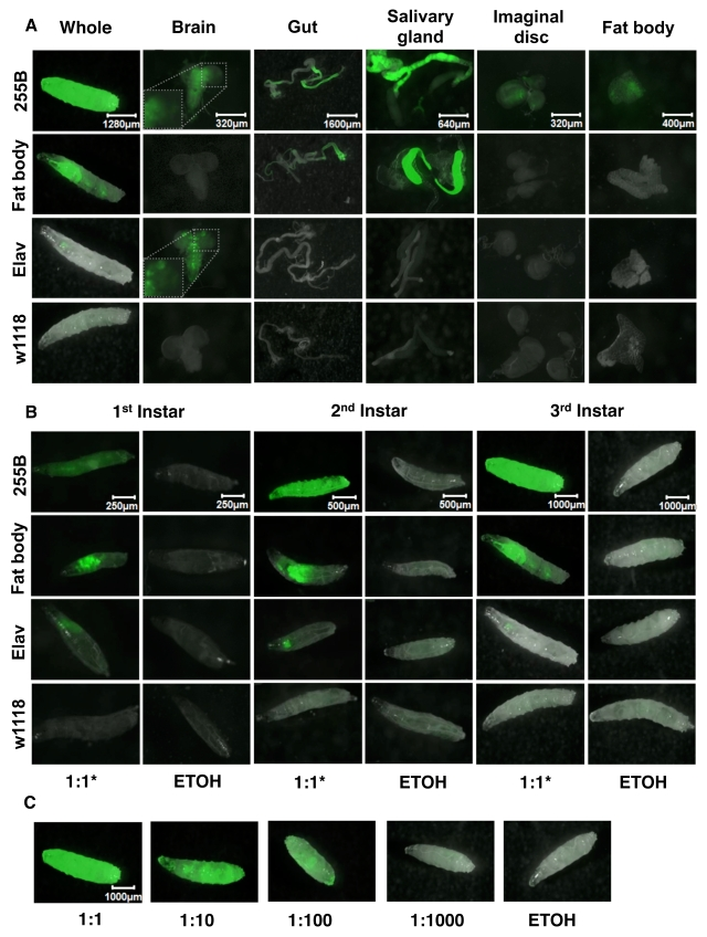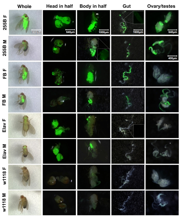 GeneSwitch driver characterization . Adult flies were cultured in vials in the presence and absence of drug for two weeks prior to dissection. Adult male and female flies, head in half, body in half, midgut and hindgut, ovary and testes, were photographed. Larvae at 1st instar, 2nd instar and 3rd instar, as well as 3rd instar dissected tissues (brain, midgut and hindgut, salivary gland, imaginal discs, and fat body) were also photographed. The Leica MZ FLIII fluorescence stereomicroscope together with the SPOT software were used for photographs: The GFP pictures were taken under the fluorescent light with exposure time 4 sec and a gain of 2.