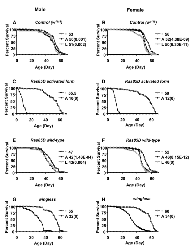 Most of the genes tested by over-expression with the ubiquitous Act-GS-255B driver did not affect life span to an extent greater than the small changes observed with the control flies. However, Ras activated form transgene was lethal when expressed in larvae, and reduced both male and female life span by -80% when expressed in adults (Figure 3C, D; Table 2). Over-expression of wild-type Ras or a Ras dominant-negative allele was not lethal to larvae, and produced only small decreases (-4% to -12%) in both male and female adult life span (Figure 2 E, F; Table 2), thereby in the range of negative effects observed with control flies. Over-expression of the wingless gene was found to be lethal to male and female larvae, using two independent wingless transgenes (Table 2). Over-expression of wingless in adult flies produced significant reductions in both male and female life span: ~-42% with one wingless transgene (Figure 3 G, H) and ~-10% with the other transgene (Table 2).