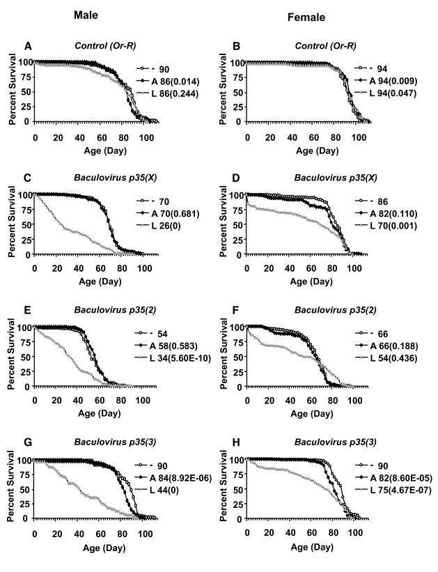 Two independent Baculovirus p35 transgenes were also over-expressed in adult flies using the head-fat-body driver S1-32, and the whole-body fat-body driver (S1-32 plus S1-106), and during larval development using the whole-body fat-body driver, however no consistent effects on life span were observed (Table 3).