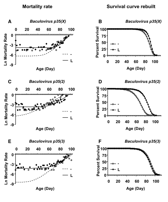 Finally, the tissue-general Act-GS-255B driver was used to over-express three different transgenes encoding the caspase inhibitor Baculovirus p35, during larval development and in adult flies (Figure 4; Table 3). Over-expression of Baculovirusp35 in adult flies using the tissue-general Act-GS-255B driver produced only small decreases in life span that were within the range observed with control flies, suggesting there were no significant effects in adults. In contrast, when Baculovirus p35 was over-expressed during larval development using the tissue-general driver, it reduced the mean life span of male and female adults by -20% to -50%. Interestingly, over-expression of each of the three independent Baculovirus p35 transgenes during larval development produced an unusual biphasic-shaped survival curve in adult females (Figure 4 D, F, H), suggesting the presence of a subset of adult female flies with unchanged or even increased life span. A Gompertz-Makeham model was found to give the best fit to the life span data for females in which Baculovirus p35 was over-expressed during larval development (Figure 5; Table 4). This analysis revealed that the decrease in mean life span was due to increased age-independent mortality. When the age-independent mortality was removed and the data re-plotted, it revealed a subset of female flies with unchanged (Figure 5 B, F) or increased life span (Figure 5D).