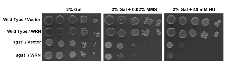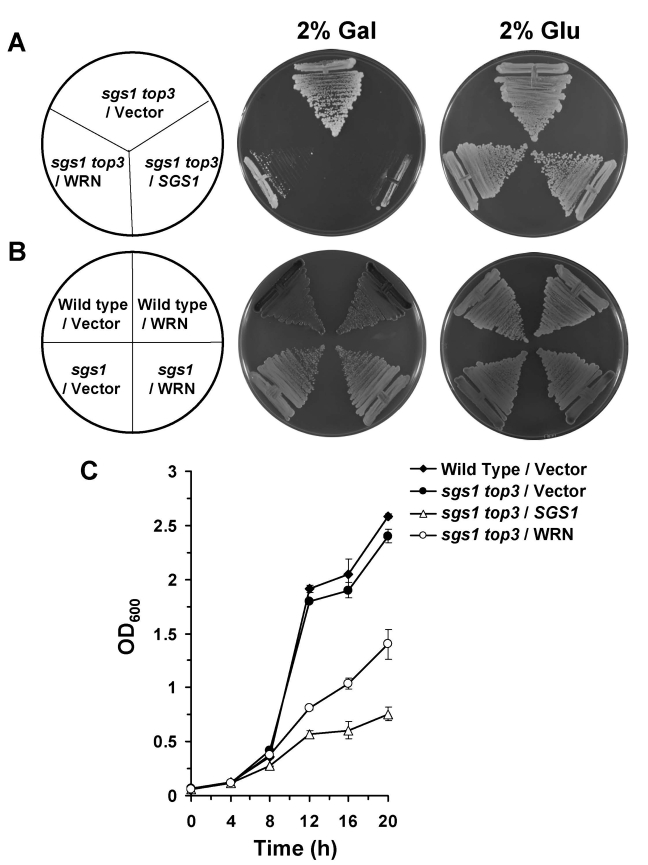 Strains mutant for top3 have pleiotropic phenotypes including severe growth defect, hyper-recombination at multiple loci, and sensitivity to the DNA damaging agents MMS and HU. However, a mutation in the sgs1 gene suppresses the slow growth rate of top3 [5]. Since it has been proposed that Top3 may be an evolutionarily conserved partner of RecQ helicases, we examined if the expression of WRN could substitute for Sgs1 and hence confer slow growth in the sgs1top3 background.