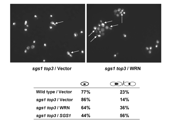 It was previously shown that top3 mutant strains are delayed in the late S/G2 phase of the cell cycle [5], a characteristic that may account for their slow growth. Mutation of the SGS1 gene in the top3 background suppresses the delay in the S/G2 phase of the cell cycle; consequently, the characteristic dumbbell shaped morphology of the top3 mutant yeast cells that have not completed cell division is suppressed by the sgs1 mutation. We examined if WRN expression could restore the delay in the S/G2 phase of the cell cycle in sgs1 top3. An elevated population of large budded cells with undivided nuclei was observed for the sgs1 top3 mutant cells expressing WRN (Figure 3). The percentage of sgs1 top3/WRN cells with dumbbell morphology was approximately 2.6-fold greater than that ofsgs1 top3/vector cells, suggesting that WRN expression in the sgs1 top3 mutant restored the characteristic S/G2 delay of top3 and this may contribute to the suppression of growth by WRN in the sgs1 top3 cells.