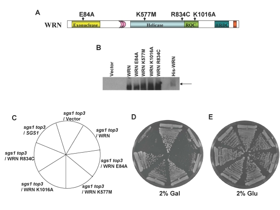 To assess the functional requirements of WRN to restore the slow growth phenotype in the sgs1 top3 background, we assessed the importance of WRN catalytic activities (helicase, exonuclease) for slow growth phenotype restoration. To do this, we constructed WRN expression plasmids containing missense point mutations in the active site of the conserved exonuclease domain (E84A) or the ATPase/helicase domain (K577M) that were previously shown to inactivate the respective catalytic activities of the purified recombinant proteins [34,35] (Figure 4A). Plasmids encoding the WRN mutant alleles were transformed into thesgs1 top3 cells and expression of the mutant WRN proteins was confirmed by Western blot analyses (Figure 4B). The effects of mutant WRN protein expression on growth were assessed by streaking the transformed yeast strains onto SC plates media with 2% gal but lacking Trp. Streak analysis revealed that the WRN-E84A exonuclease dead mutant restored the top3-associated slow growth phenotype in sgs1 top3 comparable to wild-type WRN, whereas the WRN-K577M ATPase/ helicase dead mutant failed to restore the slow growth in thesgs1 top3 as shown by its similar level of growth to that of the sgs1 top3/vector cells (Figure 4D). However, the sgs1 top3/WRN-E84A and sgs1 top3/WRN-K577M cells grew equally well in the absence of gal induction (Figure 4E). From these results, we conclude that WRN helicase but not exonuclease activity was required for restoration of slow growth phenotype characteristic of top3 in the sgs1 top3 background.