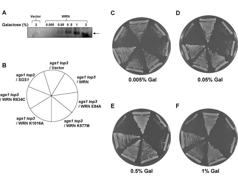 Previous studieshave shown that gene expression levels from the GAL1/10 promotorcan be regulated by altering the concentration of gal in thegrowth medium. We therefore examined the level of WRN protein expression in cells grown at lower gal concentrations (0-2%) in the presence of 2% raffinose (raf). Western blot analyses demonstrated that WRN expression was dependent on the concentration of gal in the media (Figure 5A). Quantitative Western blot analyses using purified recombinant WRN protein as standard indicated that 2.3 x 104WRN molecules/cell were present at 2% gal. As WRN expression was regulated by the level of gal, we wanted to compare the ability of WRN and its associated variants to restore the slow growth phenotype of top3 in sgs1 top3 background at lower levels of protein expression. WRN restored the slow growth phenotype of sgs1 top3 throughout the gal concentration range, including the lower gal concentrations (Figure 5C-F). Similarly, WRN-E84A mutant restored the slow growth top3 phenotype, whereas the ATPase/ helicase dead WRN-K577M mutant failed to do so (Figure 5C-F). Likewise, neither WRN-R834C nor WRN-K1016A affected the growth of the sgs1 top3 mutant (Figure 5C-F). No effect on the growth rate of wild-type parental strain (W3031B) as well as sgs1 strain was observed with WRN or its associated variants (Supp. Data Figures 2 and 3). These results demonstrate that wild-type WRN or the WRN exonuclease dead proteins are similarly able to restore the top3 growth phenotype in the sgs1 top3 background, whereas the WRN mutant proteins that have defective ATPase/helicase activity did not affect the growth of the sgs1 top3 mutant at either low or high levels of gal-induced protein expression.