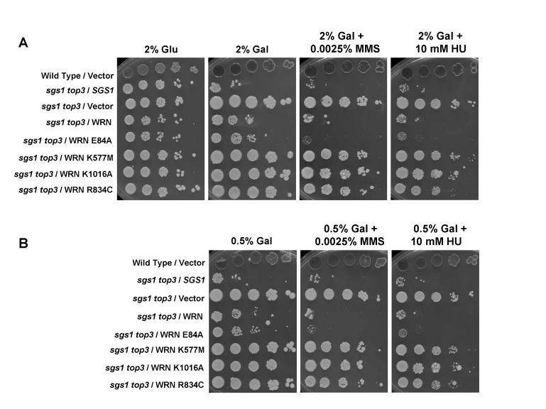 To assess the functional requirements of WRN to restore the slow growth phenotype in the sgs1 top3 background, sgs1 top3 transformed with YEp112SpGAL-WRN (E84A, K577M, R834C, and K1016A) were streaked onto SC minus Trp plates containing either glu or gal as indicated. For controls, sgs1 top3 strain transformed with YEp112SpGAL, YEp112SpGAL-WRN or YEp112Sp GAL-SGS1 was included.