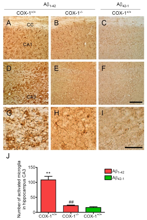 Aβ1-42 or the control reverse peptide Aβ42-1 was unilaterally injected into the lateral ventricle, as reported [32-35]. Seven days later, brains were removed and coronal sections were processed for immunohistochemistry. We assessed microglial activation in the brain using IBA-1 as a microglial marker. Aβ1-42 administration caused a robust inflammatory response within the CA1 and CA3 areas of the hippocampus of WT mice characterized primarily by the presence of activated microglia (Figure 1A, D, J). Intense IBA-1-immunoreactive microglia with enhanced staining intensity, retracted processes, perikaryal hypertrophy, and amoeboid appearance were observed in the CA3 area of hippocampus of WT mice (Figure 1G). In COX-1-/- mice, IBA-1-immunreactive microglia retained a resting morphology with specifically small cell bodies, thin, and ramified processes (Figure 1B, E, H, J). In reverse peptide Aβ42-1-injected mice, only a few faintly IBA-1-immunoreactive microglia were observed in the hippocampus (Figure 1C, F, I, J). Staining with CD11b, another marker for microglia gave results similar to that of IBA-1 (data not shown).