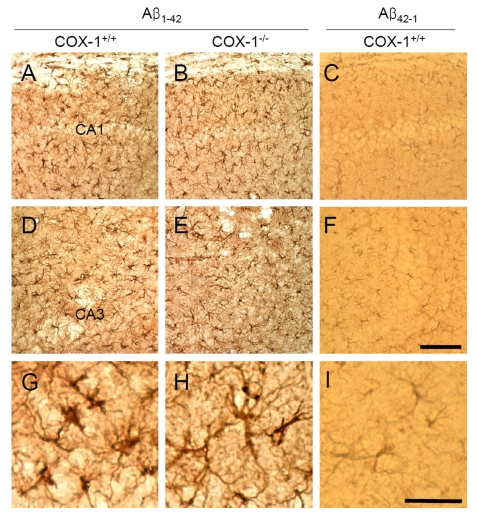 We then assessed astrocytes immunoreactivity by staining the brain of WT and COX-1-/- mice with the astrocytic marker glial fibrillary acidic protein (GFAP). GFAP-immunoreactive astrocytes in response to Aβ1-42 injection were markedly attenuated in the brain of COX-1-/- mice (Figure 2B, E, H) compared to WT mice (Figure 2A, D, G). These results indicate that Aβ1-42 administration induced less severe glial cell activation in COX-1-/- mice compared to WT mice.