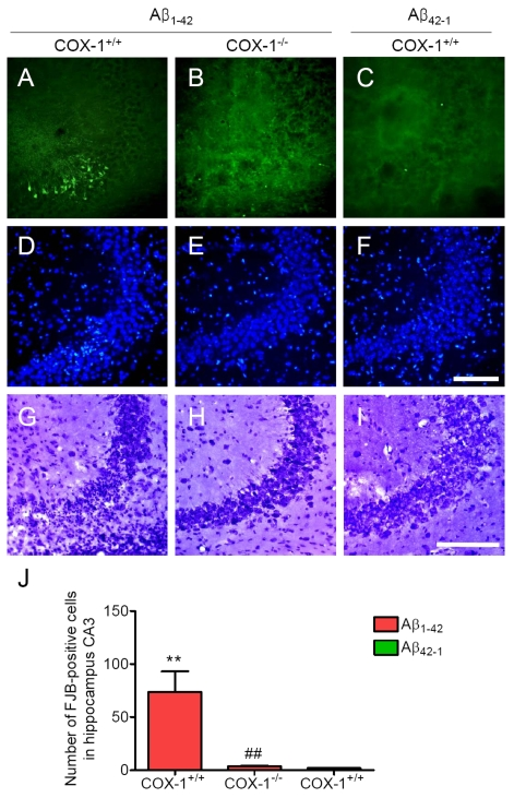 We next assessed neuronal damage in the brain using the fluorescent marker Fluoro-Jade B (FJB), which selectively labels injured neurons [36,37]. Aβ1-42 administration caused a significant neuronal damage, characterized by the presence of FJB-positive neurons within the CA3 areas of hippocampus of WT mice (Figure 3A, J). In contrast, Aβ1-42-injected COX-1-/- mice showed few scattered FJB-positive neurons in the CA3 of hippocampus (Figure 3B, J). In same sections stained with DAPI or adjacent sections stained with cresyl violet, a similar distribution of neuronal loss and gliosis was found in the CA3 areas of hippocampus in Aβ1-42-injected WT mice (Figure 3D, G). FJB and Nissl staining showed that hippocampal CA3 neurons in COX-1-/- mice were better preserved than in WT mice (Figure 3E, H). These results indicate that Aβ1-42 administration induced less severe neuronal damage in COX-1-/- mice compared to WT mice.