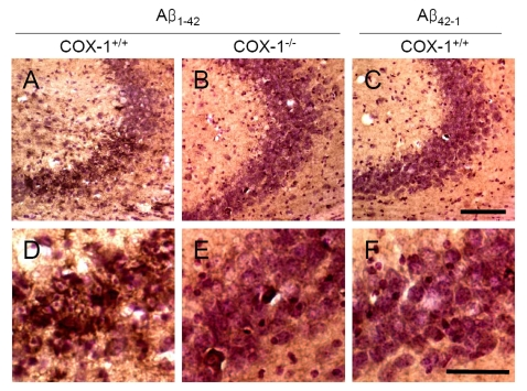 Animals and stereotaxic A β 1-42 administration. Three-month-old male homozygous COX-1-/- and their WT mice (COX-1+/+) on a C57BL/6-129/Ola genetic background were used [67]. Mice were received at our animal facility at 6 weeks of age from a NIEHS colony maintained by Taconic Farms (Germantown, NY) with heterozygous by heterozygous breedings for greater than 35 generations. In order to prevent the inclusion of strain or genetic background confounders between COX null and wild type mice, all of the mice used in this study were progeny derived from heterozygous by heterozygous mating and therefore all contained the same strain and genetic background [67,68]. The mice were housed at 25°C in our animal facility with a 12 h light/dark cyclewith free access to food and water. All animal procedures were approved by the National Institutes of Health (NIH) Animal Care and Use Committee in accordance with NIH guidelines on the care and use of laboratory animals. Aβ1-42 and reverse peptide Aβ42-1 (American Peptide, Sunnyvale, CA) were reconstituted in phosphate-buffered saline (pH 7.4) and aggregated by incubation at 37°C for 4 days before use as described previously [69]. Aβ1-42 and Aβ42-1 (400 pmol per mouse) were administered intracerebroventricularly (i.c.v) into the lateral ventricle using a 10 μl syringe with a fine needle (World Precision Instruments, Sarasota, FL) and a syringe pump (Stoelting, Wood Dale, IL) at a rate of 1 μl/min. The dose of Aβ1-42 and Aβ42-1 was selected based on previous studies [32-35]. The coordinates for the stereotaxic injections were -2.3mm dorsal/ventral, -1.0 mm lateral, and -0.5 mmanterior/posterior from the bregma [70].