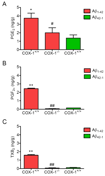 These results suggest that the reduced levels of PGE2, PGF2α, and TXB2 in COX-1-/- mice could contribute, in part, to the observed differences in glial and neuronal response to Aβ1-42 administration.