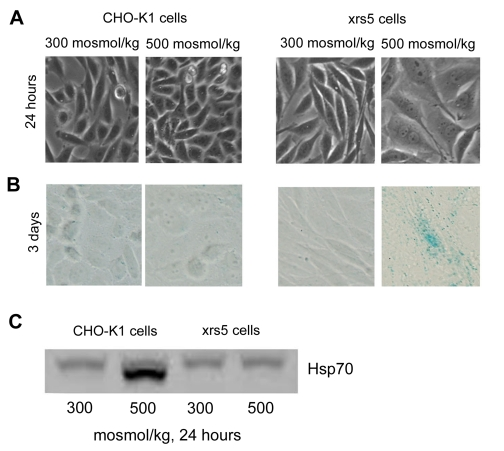In our previous studies we found that xrs5 cells undergo dramatic morphological changes upon exposure to high NaCl. They change from epithelial to fibroblast morphology, enlarge, flatten and become multinucleated [6]. To test whether the cell have become senescent, we stained them for expression of senescence associated β-galactosidase (SA-β-gal). We confirm that within 3 days of exposure to high NaCl the morphology of xrs5 cells changes dramatically (Figure 1A) and now find that, in addition, they become positive for SA-β-gal (Figure 1B), indicative of senescence. In contrast, the appearance of the control CHO-K1 (wild type) cells does not change (Figure 1A) and they do not express SA-β-gal (Figure 1B). Also, we find diminished expression of HSP70 in response to high NaCl, which is an additional indication of senescence since, although high NaCl increases expression of HSP70 [12], senescence reduces it [13,14].