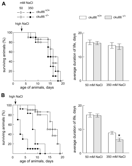 Exposure to high NaCl, starting in the larval stage, causes a greater reduction of the life span of C. elegans that lack Ku86 activity than of wild type