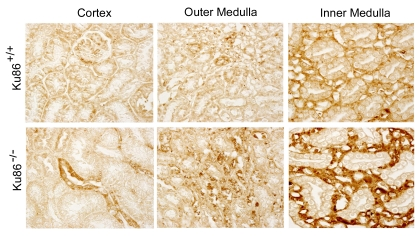 We next tested whether absence of Ku86 makes mouse renal cells more prone to high NaCl-induced cellular senescence in vivo, using expression of the cell cycle regulator p16INK4 as an indicator [16,17]. NaCl normally is always high in the renal inner medullary interstitium associated with its role in the urinary concentrating mechanism, but it is not high in the renal cortex. Using this assay, we previously found only low levels of cellular senescence in both the renal cortex and medulla at 3 months of age. At 12 months expression becomes high in the medulla, but not in the cortex [4]. In the present studies we confirm that in Ku86+/+ mice p16INK4 is not elevated in either renal inner medulla or cortex at 3 months (Figure 3). In contrast, the renal medullas, but not cortex, of Ku86-/- mice already contain numerous senescent cells at this age (Figure 3). Thus, absence of Ku86 greatly accelerates accumulation of senescent cells in the renal inner medulla. As previously noted [4], it is not renal medullary epithelial cells that become prematurely senescent, but adjacent cells that surround the tubules.