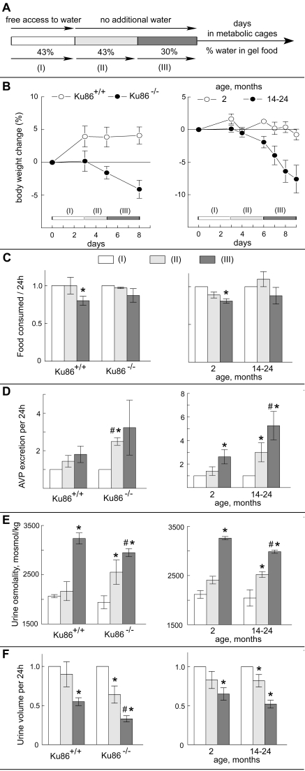 Antidiuresis, which depends on intact function of the renal medulla, is important for water conservation. Aged subjects are prone to dehydration [18,19]. The following experiments were aimed at 1) finding if old mice have a deficit in water conservation, 2) if so, whether it occurs prematurely in Ku86-/-mice, and 3) whether any deficit involves defective urinary concentrating ability. We analyzed the response of Ku86+/+ versus Ku86-/-mice and of mice of various ages to mild water restriction. The mice were maintained in individual metabolic cages. Their food was in the form of a gel, maintaining a constant amount of dry food, but variable water content (Figure 4A). The experiment was divided into three periods: (I) gel food containing 43% water, plus free access to drinking water; (II) and (III) no additional drinking water; and (III) water content of the gel food reduced to 30% (Figure 4A). Body weight, food consumption, urine volume, urine osmolality, and urinary vasopressin excretion rate were measured. Data are expressed relative to period (I). Experiments were of two sorts: Ku86+/+ versus Ku86-/-mice at 3 month of age (Figure 4, left panels) and 2 month old versus 14-24 month old wild type mice (Figure 4, right panels). Changes in body weight (Figure 4B) are an index of fluid balance since consumption of dry food (Figure 4C) either did not change significantly (Ku86-/- and 4-24 month old) or varied slightly, uncorrelated with weight changes (Ku86+/+ and 2 month old). Three month old Ku86+/+ (Figure 4B, left panel)and 2 month old wild type mice (Figure 4B, right panel) do not lose weight during the mild water restriction in periods (II) and (III). Evidently, they can regulate their water balance to avoid net loss when water is restricted. In contrast, the Ku86-/- (Figure 4B, left panel) and 14-24 month old (Figure 4B, right panel) mice lose weight rapidly, indicating that ability to maintain water balance decreases with age and that lack of Ku86 accelerates the process. Greater excretion of antidiuretic hormone (ADH, Figure 4D) provides additional evidence that Ku86-/- and 14-24 month old mice become more dehydrated than Ku86+/+ and 2 month old mice following water restriction.
