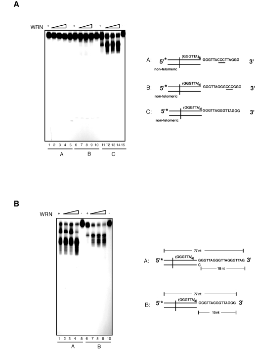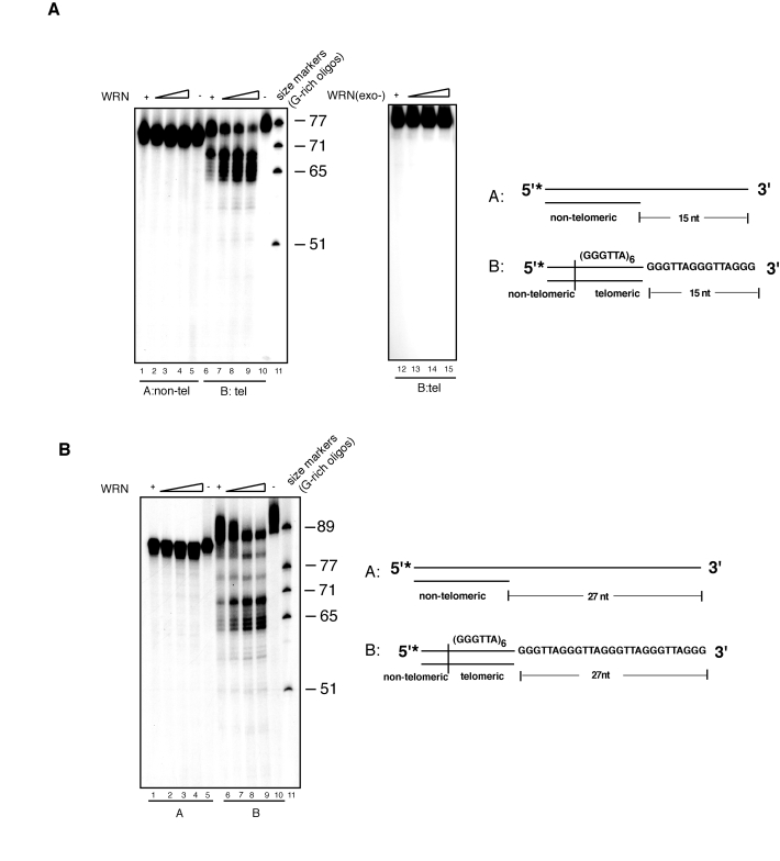 In this study we investigated the biochemical properties of the WRN protein at telomeres and describe in vitro studies that expose a unique property of WRN exonuclease on 3' single-stranded overhang of telomeric DNA substrates mimicking natural telomere termini. Here, we demonstrate that WRN exhibits sequence-specific exonuclease activity that specifically removes, in a restricted fashion, several nucleotides inward from the G-rich 3' single-stranded overhang of telomeric substrates. Close inspection and comparison of the digestion pattern among the different substrates used in this study (see Supplementary Figure 1) reveals that processing of each telomeric substrate occurs readily up to the first GGG repeat unit where it stalls; it then proceeds further inward until the next GGG repeat where it slows down again, and this pattern continues until WRN approaches the double-stranded single-stranded junction where further digestion is dramatically reduced. This activity requires the presence of telomeric sequences in both the duplex and 3' G-rich overhang DNA segments, as replacements in either the double-stranded portion or the single-stranded DNA extension that alter the normal GGGATT telomeric repeat unit result in the complete inhibition of WRN exonuclease.