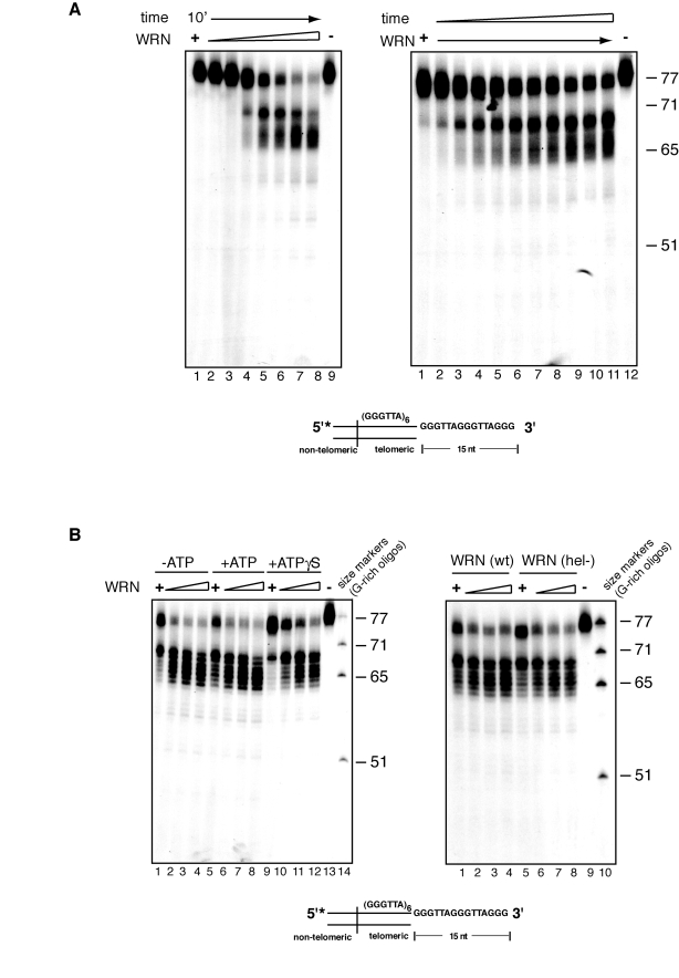 To confirm that ATPase and helicase activities do not influence the rate of extent of nucleolytic processing of the 3' overhang, a telomeric DNA substrate was incubated with a WRN variant lacking both activities (WRN K577M) and the products of the reactions were analyzed by denaturing polyacrylamide gel electro-phoresis. As shown on the right panel of Figure 2B, the pattern and intensity of DNA products generated by WRN K577M, does not significantly differ from that of wild-type WRN. Identical results were obtained when WRN K577M was incubated with the telomeric substrate in the presence or absence of ATP (data not shown).