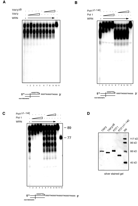To assess WRN exonuclease activity in the presence of TRF2 and POT1 variants, telomeric DNA substrates (50 fmol, 100,000 cpm) were incubated with increasing amounts (200-800 fmol) of either POT1, POT1(Δ1-140), TRF2 or TRF2ΔB in 10 μl of Buffer A (10 mM Tris-HCl pH 7.5, 80 mM NaCl, 4 mM KCl, 4 mM MgCl2, 1mM ATP, and 5% glycerol) at room temperature for 20 minutes. Then, 200 fmol of WRN was added into the reaction mixture and incubate at 37ºC for an additional 15 minutes. Each reaction was then terminated by the addition of 2.0 μl of a 95% formamide solution. After incubation at 95 °C for 3 minutes, DNA products were resolved by 12% polyacrylamide-urea gel electrophoresis and visualized by autoradiography.
