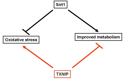 In broader terms, our findings provided evidence for the concept that the development of strategies to delay the aging process must take into account the presence of antagonistic pathways such as those mediated by Sirt1 and TXNIP on oxidative stress and metabolism. The observation that TXNIP acts as a downstream mediator of Sirt1 and a common target of various effectors of the glycolytic pathway, suggests that decreased expression of TXNIP alone may prove to be a reliable marker to evaluate and/or to predict the efficacy of putative anti-aging therapies.