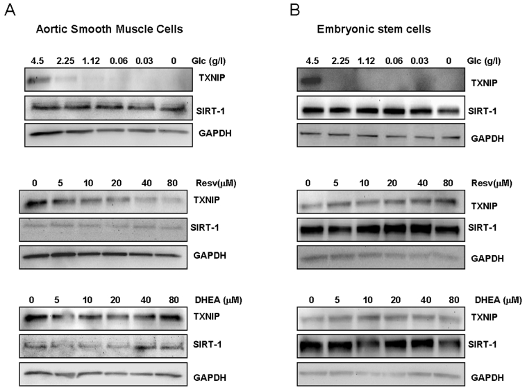 Human monocytic cells (THP-1), osteosarcoma (SaOS2), breast carcinoma MCF-7 cells, the rat retinal ganglion cells (RGCs), aortic smooth muscle cells (SMCs) and the human embryonic stem cells BG01V1 were purchased from ATCC (Rockville MA). Dulbecco's Modified Eagle's Medium (DMEM), DMEM/F12 (1/1) medium, knockout serum and fetal bovine serum (FBS) were obtained from Invitrogen (Carlsbad, CA). Cancer cell lines, HUVEC and SMC cells were maintained in their corresponding culture media and subjected to treatment with resveratrol or DHEA at concentrations ranging from 0 to 80 μM, or incubated in culture media with decreased glucose concentrations. After 48 hours of incubation, the cells were washed with PBS and re-suspended in 100 μl of lysis buffer (50 mM HEPES pH 7.4, 150 mM NaCl, 100 mM NaF, 1 mM MgCl2, 1.5 mM EGTA, 10% glycerol, 1% Triton X100, 1 μg/ml leupeptin, 1 mM phenyl-methyl-sulfonyl-fluoride). Equal amounts of proteins were analyzed by Western blot for expression of Sirt1 and TXNIP.