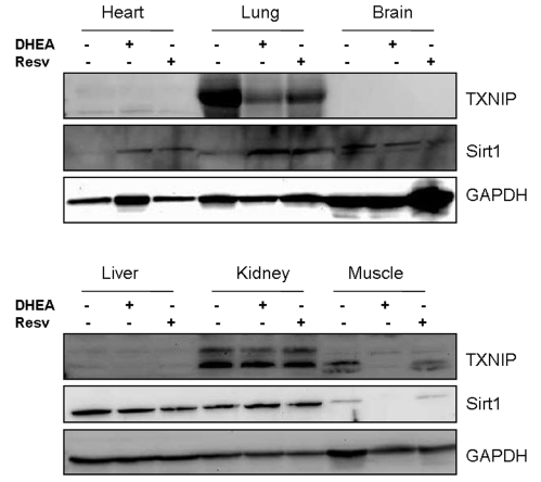 In order to determine whether the observed effects in vitro could be also valid in vivo, we have subjected the nude mice (CD1 strain, Charles River) to treatment with either resveratrol or DHEA (10 mg/Kg each) for 2 days. The animals were then sacrificed and major organs harvested to analyze expression of Sirt1 and TXNIP by Western blot. As shown in Figure 4, the relative expression of these two genes was tissue specific. While Sirt1 is expressed in most organs tested; TXNIP was found to be expressed mainly in the lung, kidney and the muscle. Both resveratrol and DHEA inhibited the expression of TXNIP in the lung, however only DHEA had an inhibitory effect in the muscle. Sirt1 was not significantly affect in most tissues except in the muscle of animals treated with DHEA. Taken together, these findings suggest that resveratrol and DHEA are capable of regulating the expression of TXNIP and Sirt1, however in a tissue-specific manner.