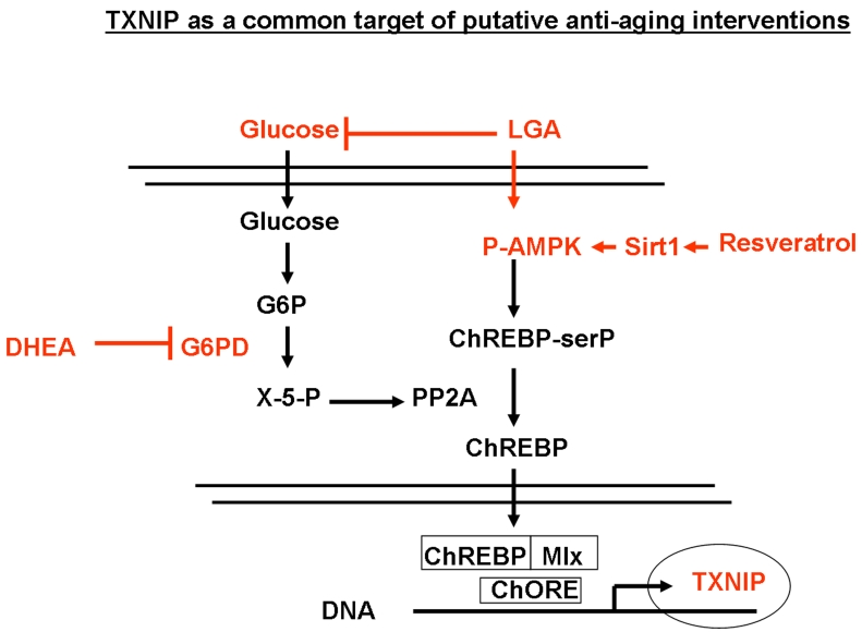 Taking into account this antagonistic relationship between Sirt1 and TXNIP regarding their effects on oxidative stress and metabolism (Figure 1), it is important to determine if, and how putative anti-aging approaches would affect the function of these two genes, and whether a regulatory relationship might exist between them. To address these possibilities, the present study investigated the effects of limited glucose availability (used here to mimic the effects of calorie restriction), the Sirt1 activator (resveratrol), and the hormone dehydroepiandrosterone (DHEA), on expression of Sirt1 and TXNIP in different cellular systems, including cancer, stem cells and a mice model. A potential link between these two genes and the underlying mechanisms leading to their regulation were also investigated. Our results indicated that each of the treatment approaches tested exerted effects on the expression of Sirt1 and TXNIP, however to various degrees. Interestingly limited glucose availability was the only approach that consistently reduced TXNIP expression in all the systems studied. Resveratrol and DHEA exerted inhibitory effects on TXNIP in a tissue specific manner, in addition, they were found to act on separate branches of the glycolytic pathway mediated respectively by AMPK and Glucose 6 phosphate dehydrogenase respectively. Overall, our findings suggest that dual targeting of antagonistic pathways implicated in the aging process must be considered in the design of anti-aging strategies. They also shed light on TXNIP as a downstream target of Sirt1 and therefore as a potential marker to predict or to evaluate the efficacy of putative anti-aging therapeutics.