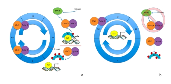 Under normal somatic cell cycle conditons, Rb/p105, in the hypophosphorylated state, interacts with E2F transcription factors inhibiting the transcription of genes necessary for the progression of the cell cycle through the restriction point (R point). The phosphorylation levels of Rb/p105 are dependent upon the CDK activity present in the cell. Mitogen signaling through the Ras/Raf/mitogen activated protein kinase (MAPK) pathway activates the cyclin D - CDK4/6 complexes, which are believed to initially activate Rb/p105 activity by hypophosphorylating the unphosphorylated protein. To pass the R point of the cell cycle cyclin E/CDK2 hyperphosphorylates Rb/p105 inhibiting the protein from binding to E2F transcription factors thus initiating the transcription of genes required in the S phase of the cell cycle. To obtain a cell cycle that is less influenced by mitogen variations, stem cells appear to adopt a different regulation mechanism as depicted in Figure 1 [25,26].