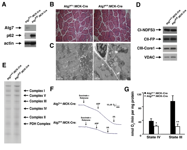 In an effort to more fully characterize the role of autophagy in the maintenance of normal mitochondrial function, we created a conditional knockout model in which Atg7, an essential gene required for autophagosome formation, was deleted from mouse skeletal muscle. We initially chose this model because skeletal muscle is an abundant tissue that is also a rich source of mitochondria. As expected, muscle protein lysate from animals expressing the Cre recombinase under the control of the muscle creatine kinase (MCK) promoter demonstrated reduced Atg7 expression when compared to skeletal muscle tissue obtained from control mice (Figure 1A). Coincident with a reduction in Atg7 expression, we noted a marked increase in the level of p62, a protein cleared in large part through autophagy and whose levels are routinely used as a marker of overall autophagic flux [16]. Although these results suggest that autophagy in skeletal muscle was largely impaired in these conditionally ablated animals, when compared to control animals, we observed no obvious differences in terms of viability, overall size and activity, serum parameters or generalized appearance of the Atg7F/F:MCK-Cre mice throughout the first year of life (unpublished observations). In addition, histological analysis revealed no discernable skeletal muscle structural abnormalities between knockout and control mice (Figure 1B). In contrast, electron micrographs demonstrated that Atg7F/F:MCK-Cre mice accumulated markedly abnormal mitochondria that were especially evident in the sub-sarcolemma region of muscle fibers. These abnormal mitochondria appeared less electron dense and were often swollen, lacking in cristae, or dysmorphic in appearance (Figure 1C). Despite these profound differences in mitochondrial appearance, we observed no obvious alterations in the composition of the various cytochrome complexes (Figure 1D), nor were there obvious differences in the assembly of individual electron transfer components using Blue Native Gel analysis (Figure 1E).