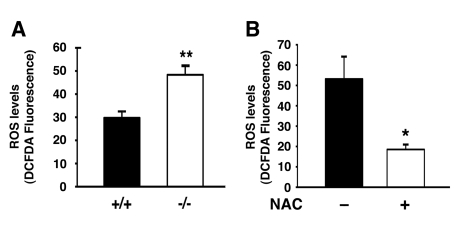 Damaged mitochondria often produce increased levels of reactive oxygen species (ROS). This increase in ROS can further increase mitochondrial damage leading in turn to more oxidant release and additional mitochondrial damage, in a process termed the ‘vicious cycle'[17]. In some circumstances, this perpetuating cycle of mitochondrial damage and oxidative stress is thought to contribute to normal aging as well as many age-related diseases [18]. Given the above observations, we next sought to assess whether continuous oxidative stress was evident in autophagy deficient cells. As noted in Figure 3A, Atg7-/- MEFs had increased levels of intracellular ROS. Culturing these cells in the presence of the antioxidant N-acetylcysteine (NAC) resulted in a reduction in ROS levels (Figure 3B).