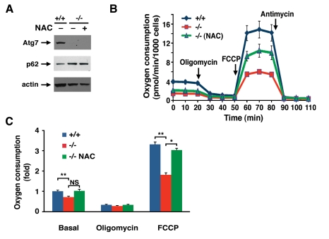 Antioxidant treatment did not appear to alter the level of autophagic flux in Atg7-/- MEFs as the level of p62 was unaltered in NAC treated cell (Figure 4A). However, chronic NAC treatment did partially ameliorate the observed metabolic defect seen in these cells (Figure 4 B, C). These results suggest that the continuous oxidative stress observed in Atg7-/- MEFs contributes to the decline in mitochondrial function.
