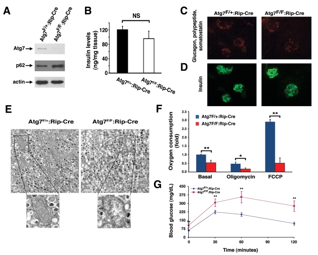 Given the profound alterations observed in isolated mitochondria derived from Atg7 deficient skeletal muscle and the observation that NAC treatment could at least partially reverse the metabolic defects observed in Atg7-/- MEFs, we next sought to assess whether these principles could be applied to the physiological defects seen in an in vivo model of Atg7 deficiency. Since our skeletal muscle conditional Atg7-/- mice did not exhibit an overt phenotype, we created an additional model in which Atg7 was deleted within pancreatic β cells by crossing the Atg7-floxed mice with RIP2-Cre animals. Western blot analysis from purified pancreatic islets demonstrated that conditional knockout animals (Atg7F/F:RIP2-Cre) had reduced or absent Atg7 expression and a corresponding increase in p62 levels (Figure 5A). In young mice, deletion of Atg7 within β cells did not result in significant alterations in pancreatic insulin expression (Figure 5B). Similarly, the cellular composition of individual pancreatic islets was largely unperturbed in 8 week old mice (Figure 5 C, D). In contrast, electron micrographs of control or knockout tissues revealed the early accumulation of markedly abnormal mitochondria within the β cells of Atg7 deficient mice (Figure 5E). Analysis of basal and FCCP-stimulated respiration from isolated pancreatic islets revealed a significant decrease in basal mitochondrial respiration and a marked decrease inmitochondrial oxidative capacity in Atg7 deficient islets (Figure 5F). Consistent with previous reports describing animals with alterations in β cell mitochondria [12,13,19], mice lacking Atg7 within their β cells also exhibited marked abnormalities in glucose tolerance (Figure 5G).