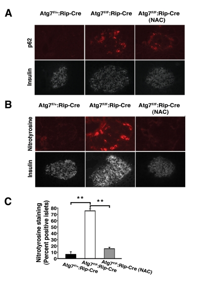 We next asked what the role of continuous oxidative stress was in this model of β cell dysfunction. We randomized knockout or control mice beginning at age 4 weeks to treatment with or without NAC. As expected, when compared to control animals, mice with conditional ablation of Atg7 accumulated increased levels of p62 within their islets (Figure 6A). Treatment with NAC did not noticeably affect this accumulation in conditionally ablated animals (0/18 islets p62 positive in Atg7F/+:RIP2-Cre mice; 22/24 islets p62 positive in Atg7F/F:RIP2-Cre mice and 17/17 islets p62 positive in Atg7F/F: RIP2-Cre mice treated with NAC; in random slides obtained from n=3 mice per condition). In addition, as an in situ marker of oxidative stress, we measured nitrotyrosine levels which are known to increase and contribute to the diabetic phenotype [20]. As noted, levels of nitrotyrosine were markedly elevated in Atg7 deficient islets and in contrast to our observations with p62, treatment with NAC was very effective in reducing the observed increase (Figure 6 B, C).