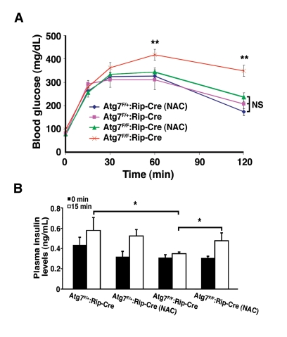 Using a variety of cellular and in vivo models, we demonstrate that impairment of autophagy leads to the accumulation of damaged and dysfunctional mitochondria and a corresponding increase in intracellular ROS levels. In a model of autophagy deficiency occurring within the pancreatic β cell, we further demonstrate that the overall physiological impairment in glucose tolerance and insulin secretion can be significantly ameliorated by the simple addition of an antioxidant. While assessment of autophagic flux by p62 expression suggests that NAC treatment does not directly affect autophagy, the ultimate improvement of glucose tolerance and glucose-stimulated insulin secretion suggests that at least for this in vivo model, continuous oxidative stress plays an important pathophysiological role.