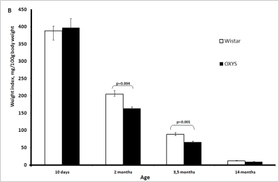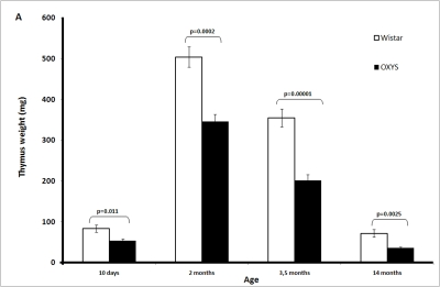 The absolute weight of the thymus in OXYS rats is significantly lower than in Wistar rats (Figure 1A-F). This is partially due to smaller body weight of OXYS rats. However, at age 2 and 3.5 months, not only absolute thymic weight but also thymic weight normalized to the body weight (thymic index) of OXYS rats was shown to be lower than that of Wistar rats (Figure 1B).