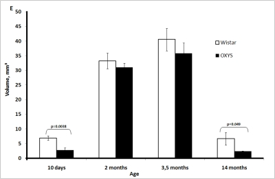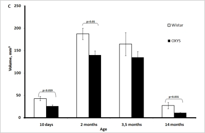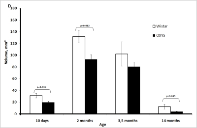 The volume of the medulla also increased in both strains of rats between 10 days and 2 months of age, reached a maximum at 3.5 months, and then declined (Figure 1E). The medulla volume was always lower in OXYS rats.