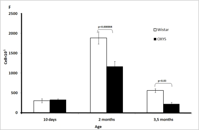 Experiments were performed on a normal (Wistar) and a fast senescence-prone (OXYS) rat strains, the latter suffering from constant oxidative stress. In OXYS rats, involution of the thymus was shown to occur faster than in Wistar rats (Figure 1A-F, Table 1).