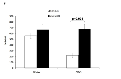 Data on amounts of various cell fractions in the thymus of Wistar and OXYS rats treated and non-treated with SkQ1 are shown in Table 2. The table shows that percentage content of various subpopulations of thymo-cytes did not undergo significant changes as a result of the SkQ1 treatment. However, the analysis of absolute values revealed very strong positive effect of SkQ1.
