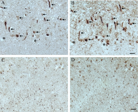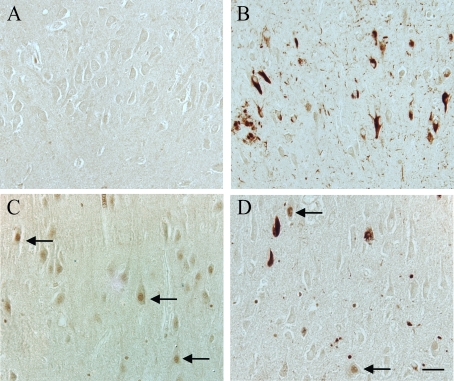The presence of pSer40/41 Mcm2 (pMcm2) protein was detected using the immunocytochemistry methods discussed in the corresponding section. All of the AD cases examined demonstrated significant accumulation of pMcm2 in NFTs, dystrophic neurites, and neuropil threads (Figure 1B). In most cases, glial nuclei were often stained, and in a small number of cases, some pyramidal cell nuclei within the CA3 region showed significant pMcm2 reactivity (Figure 1D, arrows). In similar areas in most control cases, no staining was seen (Figure 1A), in a small number of aged control cases, pyramidal neuron nuclei showed high pMcm2 protein levels (Figure 1C). In some of the aged controls, a small number of pathological structures (NFT, neuropil threads,etc) were labeled with the pMcm2 antisera (data not shown).